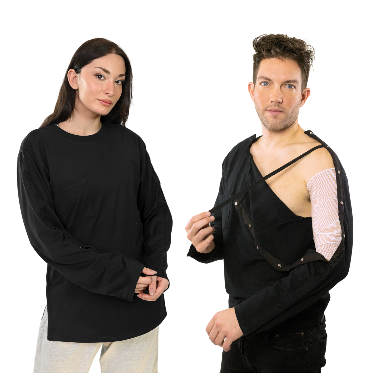 [Designed to accommodate a variety of post surgery recovery needs] Contains SHOULDER and ARM snaps, as well as SIDE snaps on each side allowing easy access to the affected area. Has an INTERNAL STRAP attached to the shirt to hold it in place, so you can leave behind ill-fitting, baggy shirts. A front chest POCKET allows you to keep essentials on the go.