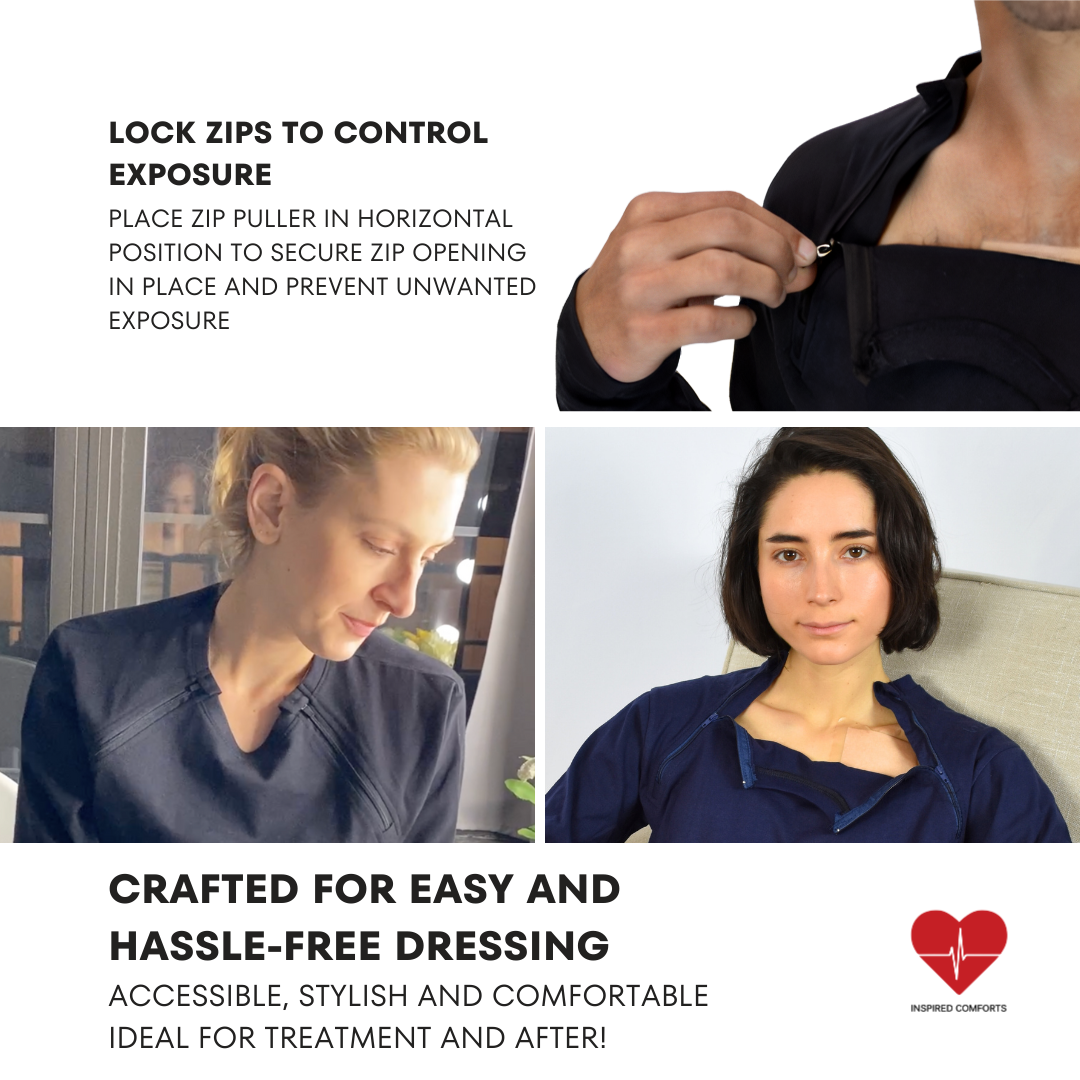 [Thoughtfully designed for chemotherapy] This shirt features dual zippers, allowing for easy access to chest ports and PICC lines. It includes a specially placed lining to ensure no contact between the zipper and your skin, keeping you as comfortable as possible during treatment.