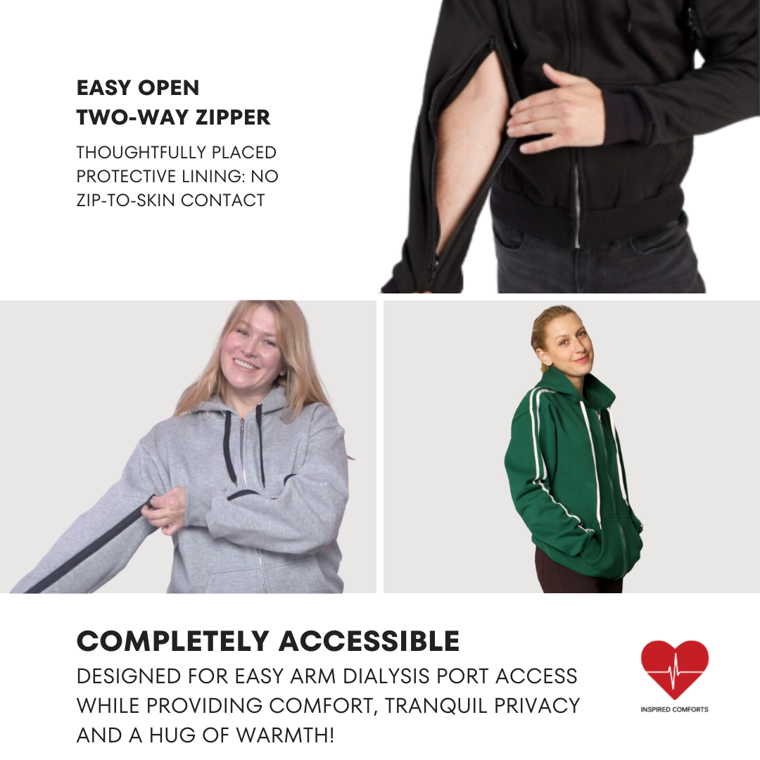 [Designed Specially for Dialysis Comfort] – This hoodie features two-way zippers on the arms, providing easy access to ports while ensuring no skin contact, thanks to thoughtfully placed fabric layers for irritation-free wear. The loose, relaxed fit offers extra space around the arms to keep you comfortable during dialysis, allowing techs to adjust access as needed.