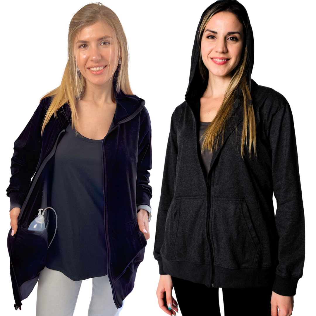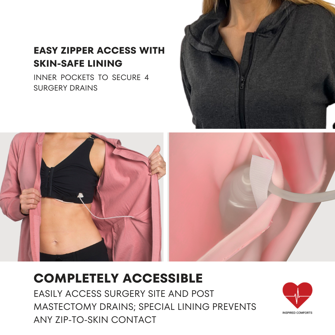 [ Thoughtfully Designed to Support Mastectomy Recovery ] The ZIP CLOSURE design allows effortless access to the drain pockets. Our hoodie features INTERNAL pockets that hold up to FOUR JP drains (two on each side)