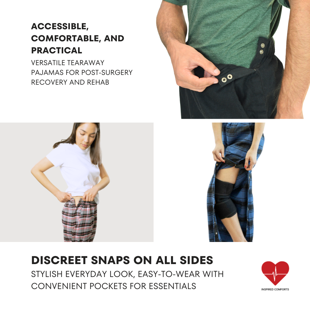 [Classic Design, Enhanced for Practical Use] With the relaxed look of lounge pajamas, these tear-away pants include DEEP SIDE POCKETS, making it easy to store your phone, wallet, and other small items.