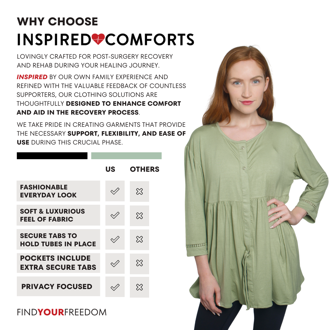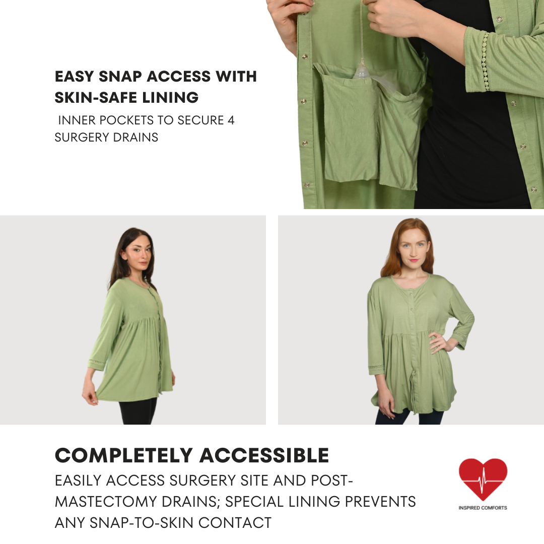 [Comfort, Style, and Dignity in Every Detail] Designed with PRIVACY, SECURITY, AND ELEGANCE in mind, each pocket is equipped with snap closures to keep your drains secure, giving you confidence and peace of mind. Fashion-forward details like lace accents on the sleeves and a HIDDEN PLACKET for front snaps ensure you feel stylish and dignified during and after your recovery journey.