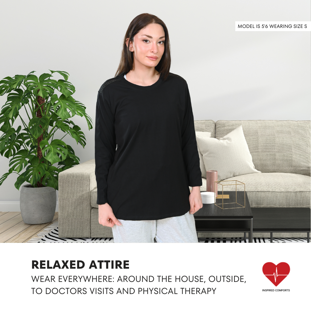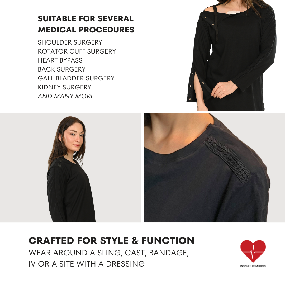 I got to wear it for the first time yesterday after my carpal tunnel surgery and it was so easy to open the arm to get my bandages inside. Would be good to be able to get tops in lighter weight fabric for warm climates. I live in Florida.