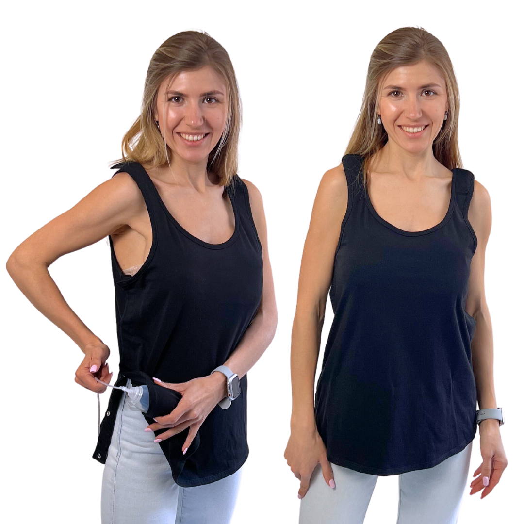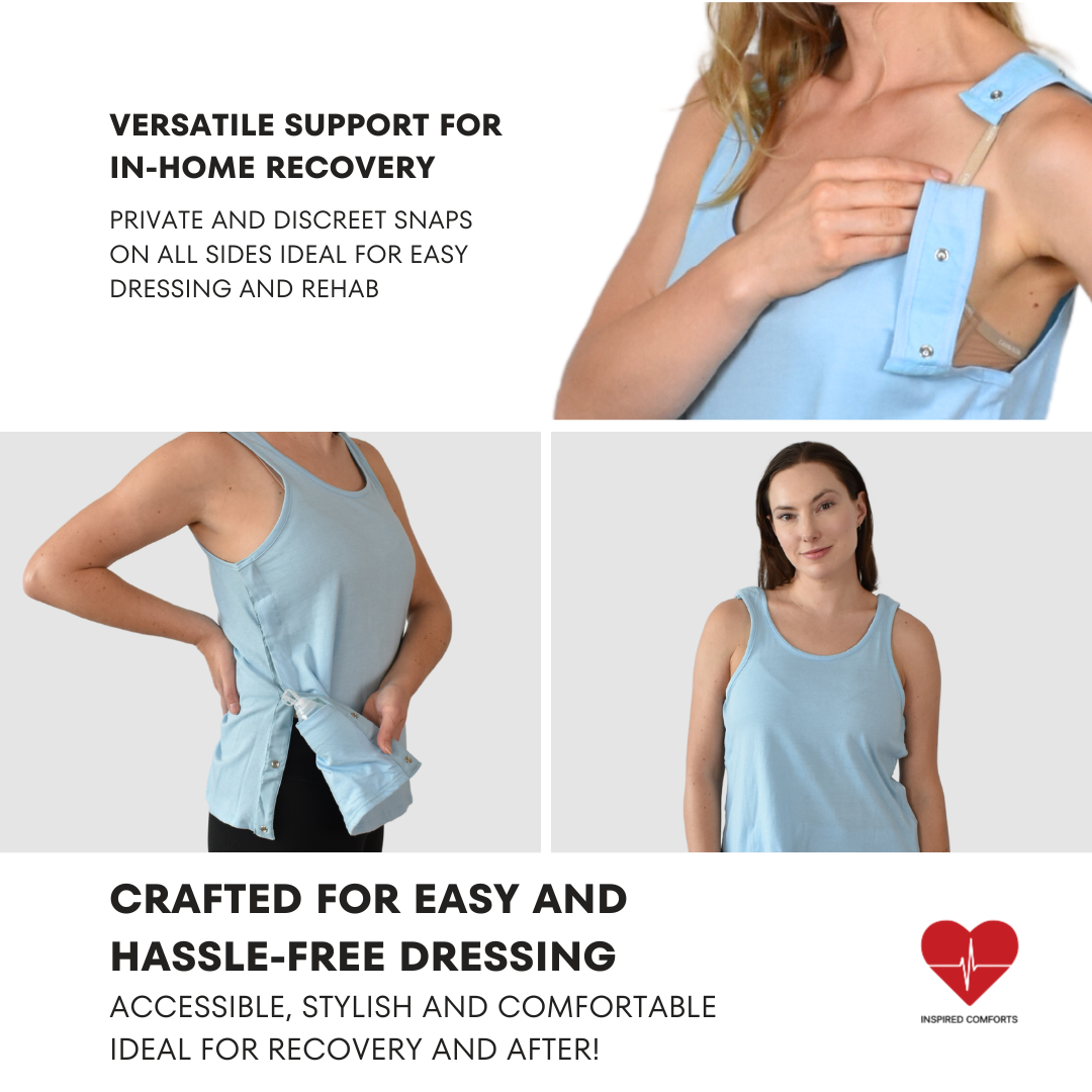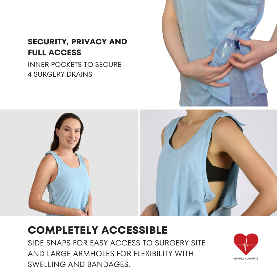 This tank is perfect for post-mastectomy recovery. The snaps on the top and the side allow you to keep your arms down and put the top on easily. You can also turn it inside out if you need the pockets/drains facing out for easier access.