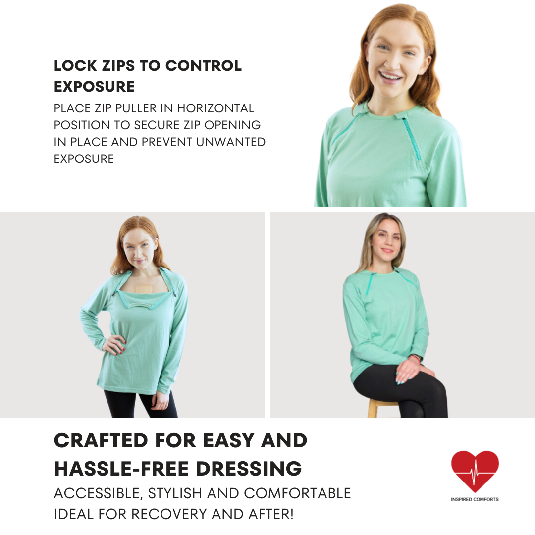 Lightweight long-sleeve top offering discreet, dignified chest port access. There are days...